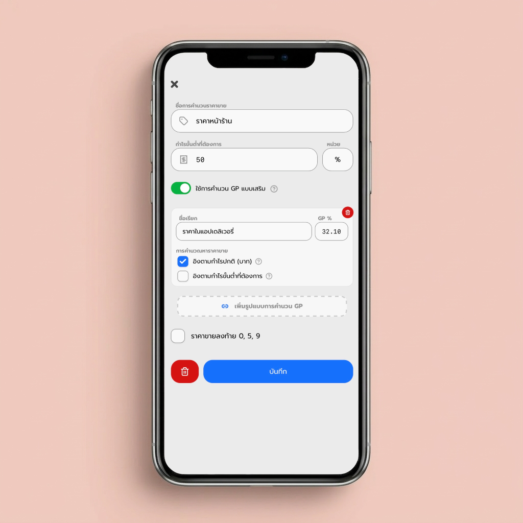 แค่ใส่ % GP ที่โดนหัก ระบบจะคำนวณราคาขายใหม่ให้ทันที โดยยึด "กำไรเป็นบาท หรือ %" ให้เท่ากับตอนขายหน้าร้าน