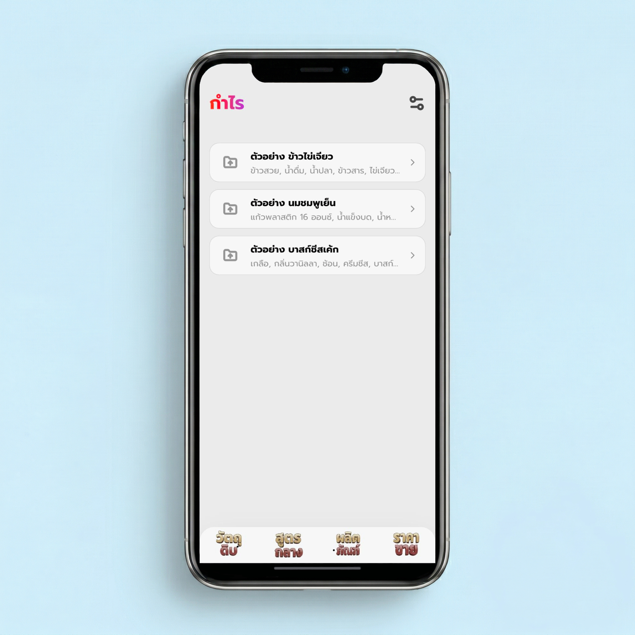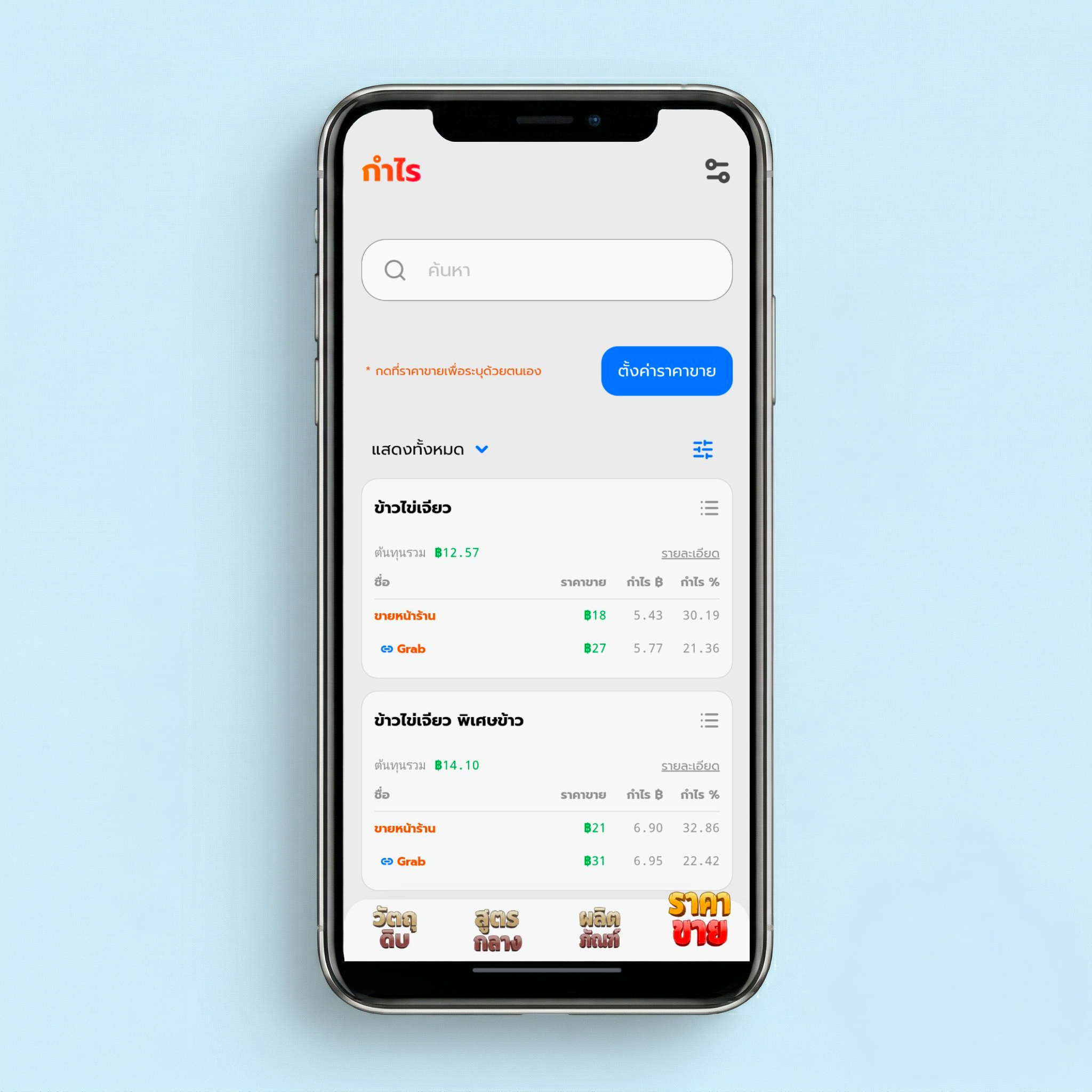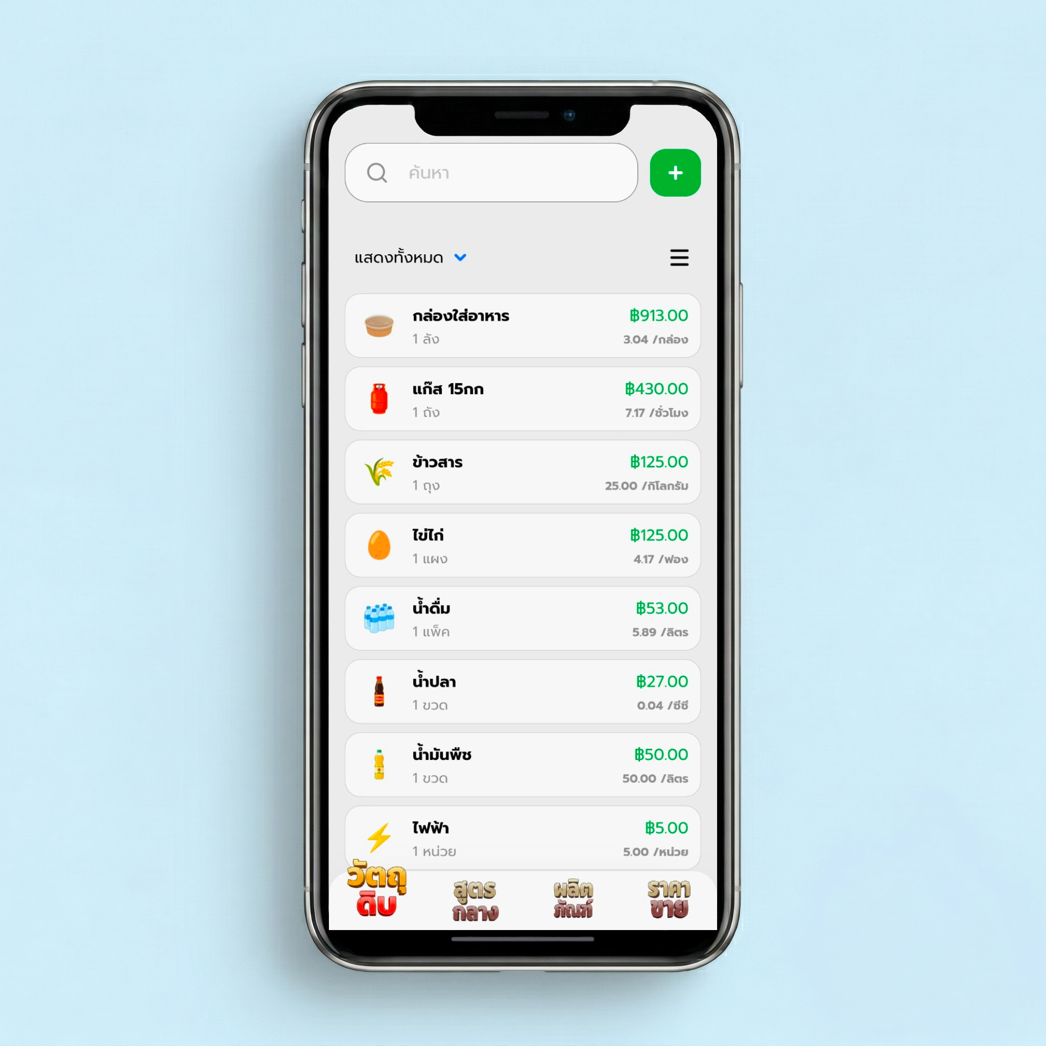 รายการวัตถุดิบและต้นทุนพื้นฐานเด้งมาให้ดูครบ ไม่ต้องนั่งกรอกเองแต่แรก